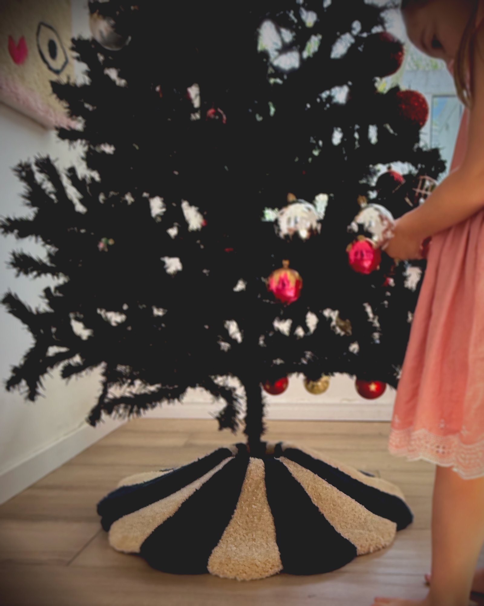 Alfombra para el pie del arbolito de 75cm de diámetro. Hecha a mano en lana 100% acrílica con técnica de tufting. Se coloca al pie del árbol, aportando textura y color al ambiente.